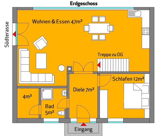 Erdgeschoss mit zwei Eingängen und Terrasse