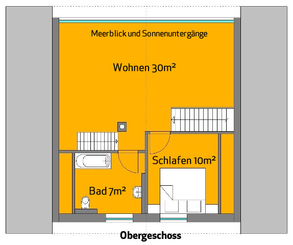 Auch im Obergeschoss gibt es einen großen gemütlichen Raum mit Glasfront und schönen Blick ins Grüne und zur Ostsee. Hier lassen sich Sonnenuntergänge ganzjährig genießen. Im großen Wohnraum befindet sich ein ausklappbarer Futon für 2 Personen. Jeweils 2 Wände sind durch das Finndach schräg. Die Fenster der Glasfront lassen sich öffnen.